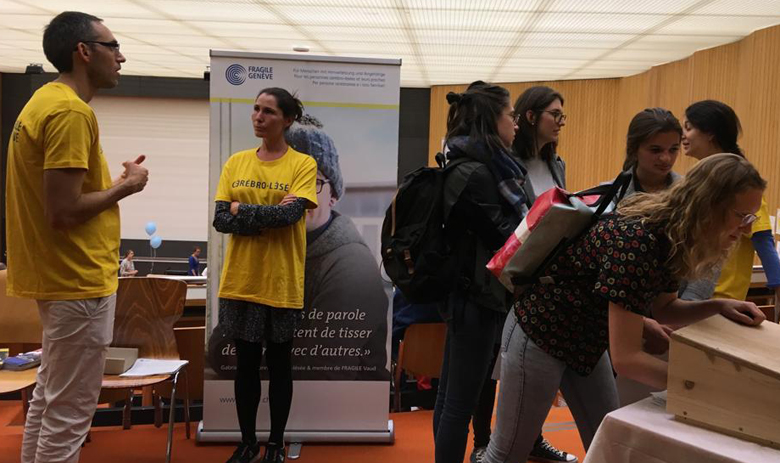 À l’intérieur de l’auditoire Marcel Jenny, le stand de FRAGILE Genève visait à sensibiliser le public sur les lésions cérébrales telles que l’AVC. Différentes animations ont ainsi été proposées par les membres de l’association, reconnaissables par leur T-shirt jaune.