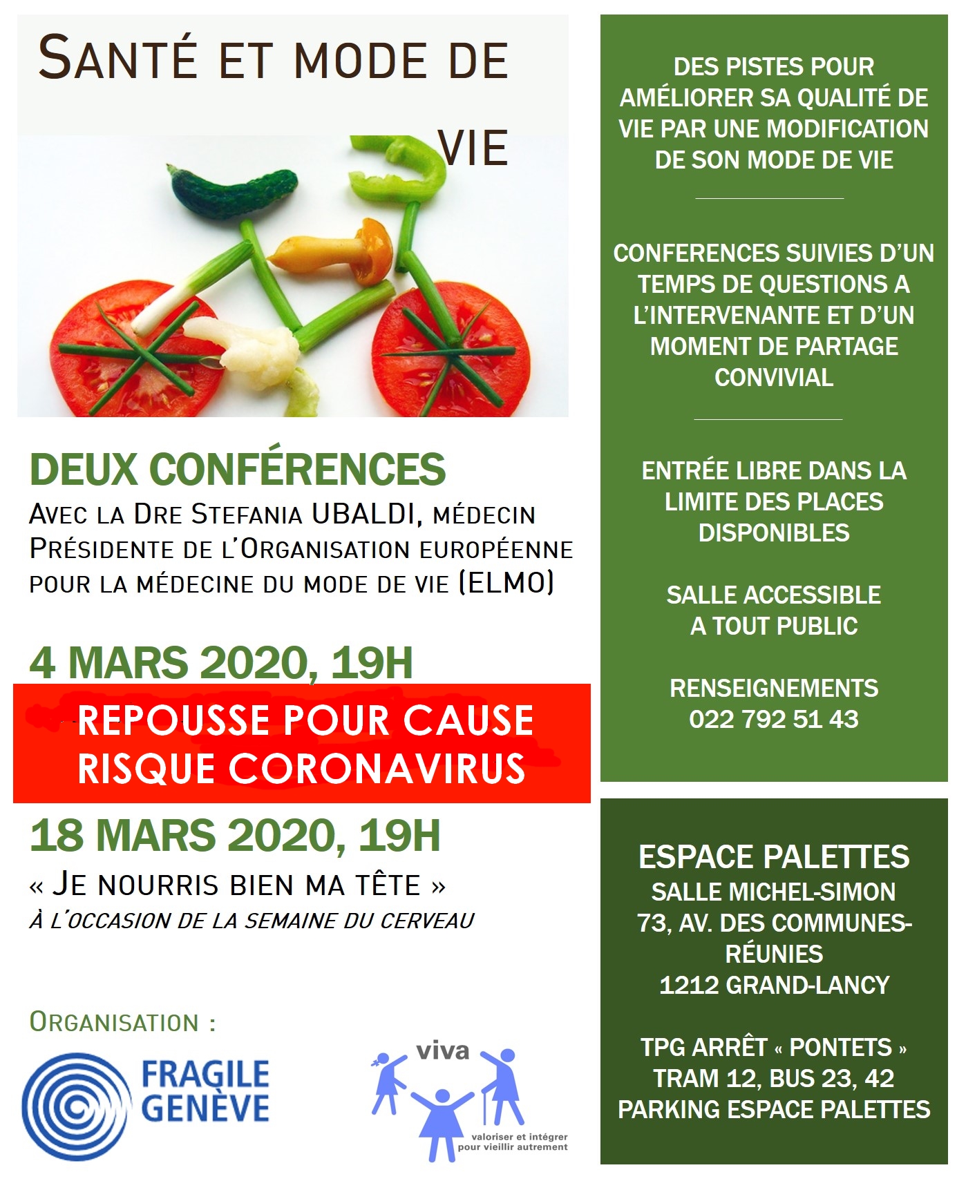 Pour aborder ce thème, FRAGILE Genève organise deux soirées avec la Dre Stefania Ubaldi, fondatrice et présidente de l’Organisation européenne de la médecine du mode de vie (ELMO), qui abordera les liens entre mode de vie, nutrition et cerveau le 18 mars à 19h à la salle Michel-Simon de l’Espace Palettes à Lancy. Entrée libre.